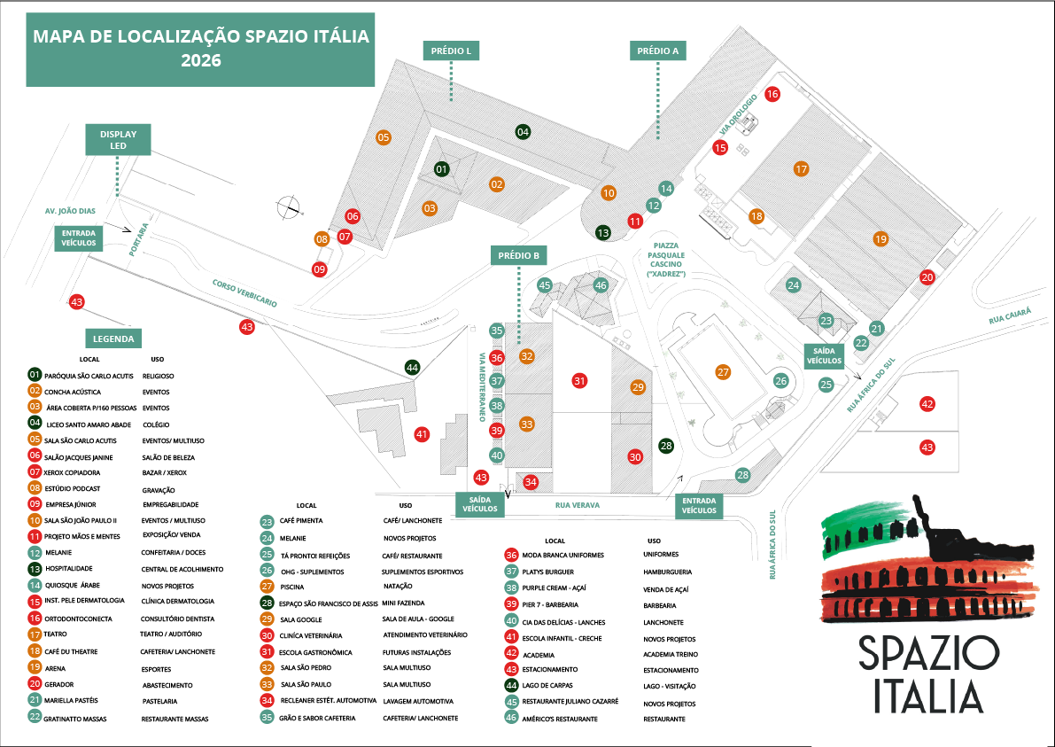 O Spazio Itália é um oásis na zona sul de São Paulo. Localizado na Avenida João Dias, 2046 (próximo ao Terminal João Dias), oferece uma estrutura ampla e com extensa área verde, ideal para coworking, práticas esportivas, treinamentos, palestras, apresentações e diversos outros eventos corporativos de pequeno e grande porte.